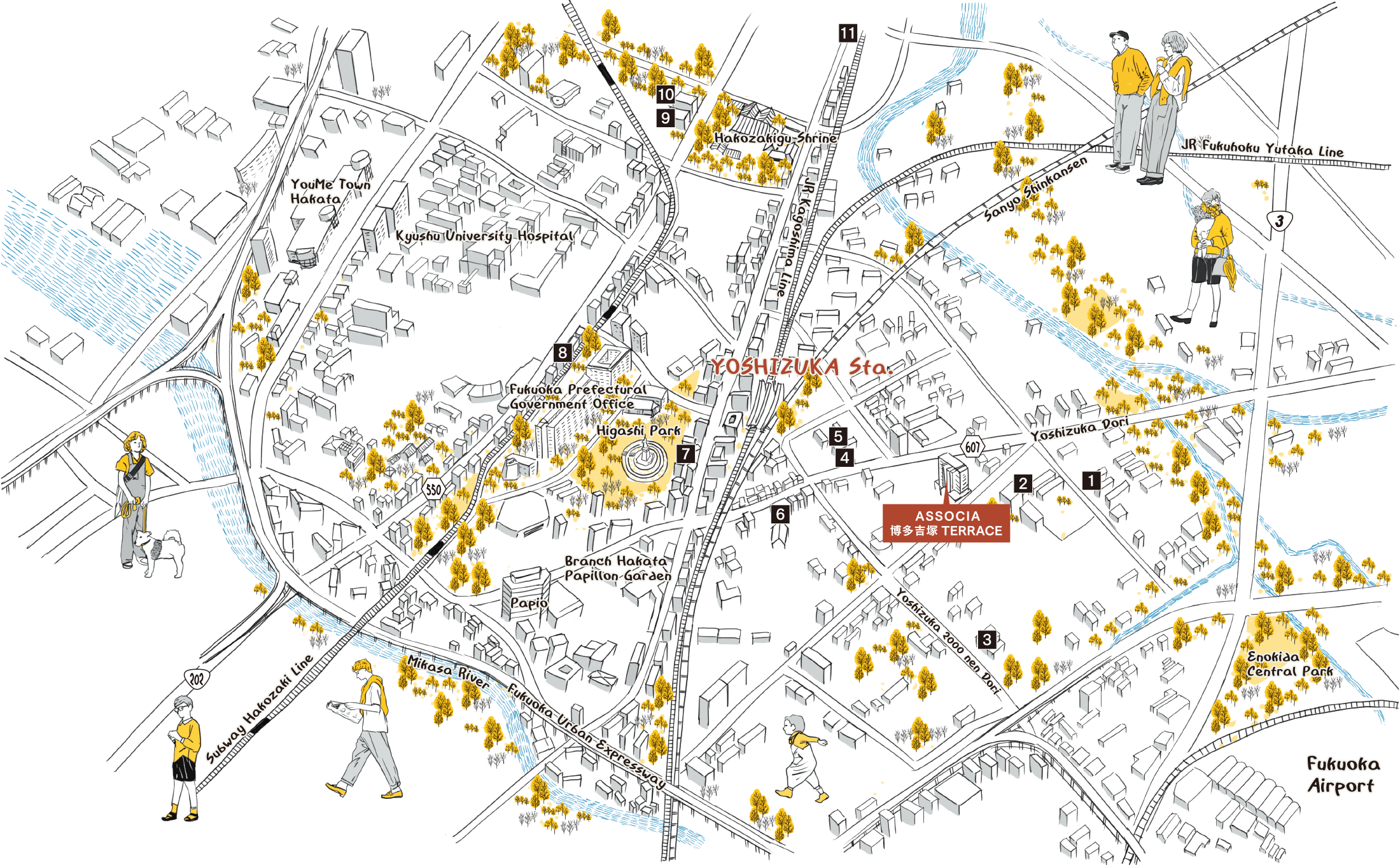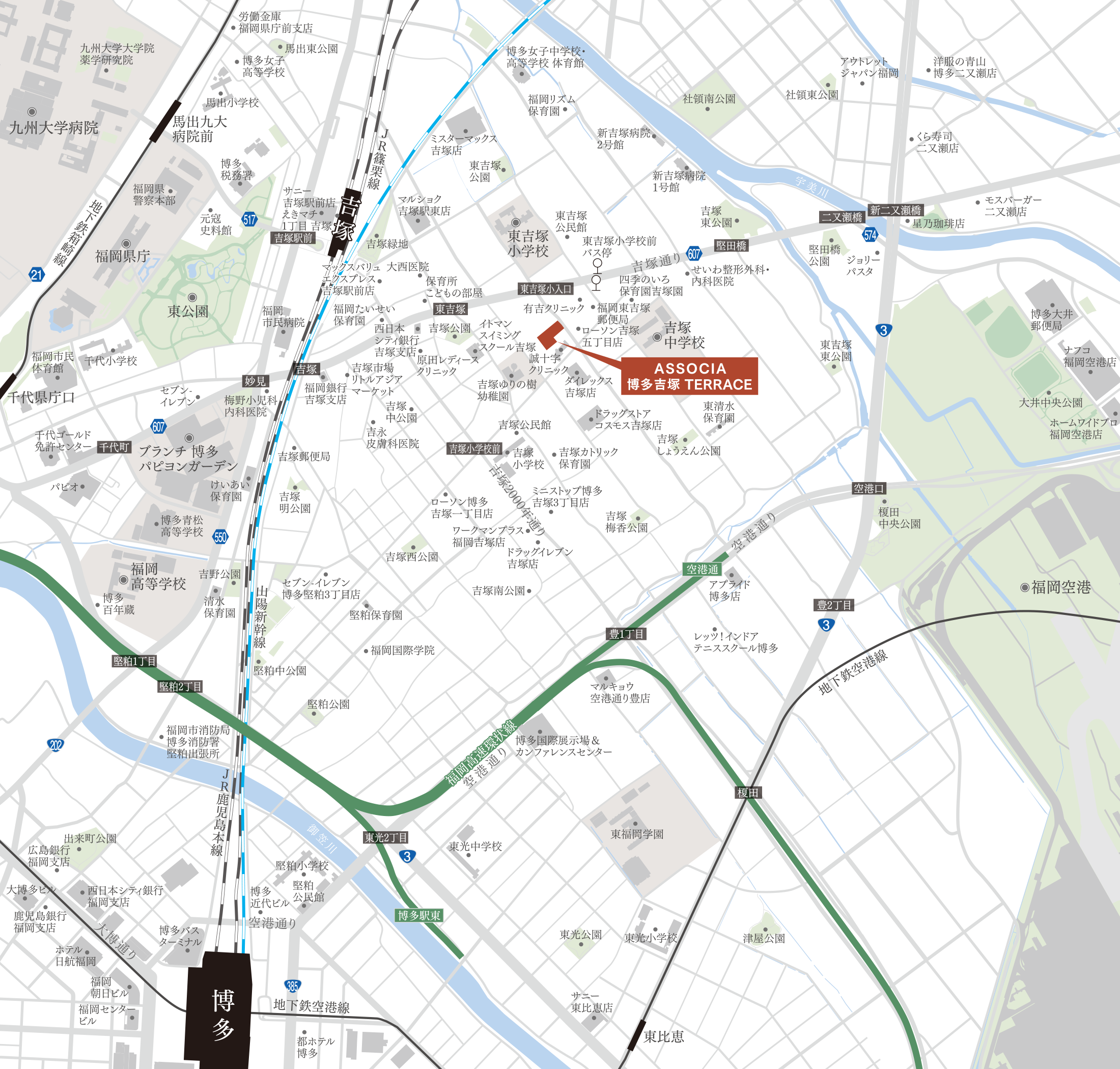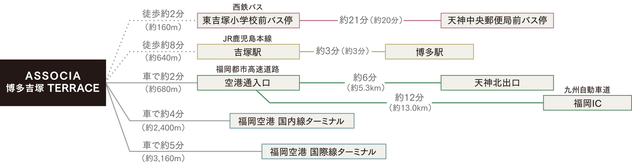 ※記載距離は、住宅地図をもとに建物のエントランスからの最短距離を計測し、徒歩分数は1分=80m(端数切り上げ)にて算出、車は一般道を時速40kmにて算出(端数切り上げ)、福岡高速道路は公式HPの標準所要時間を採用しています。
