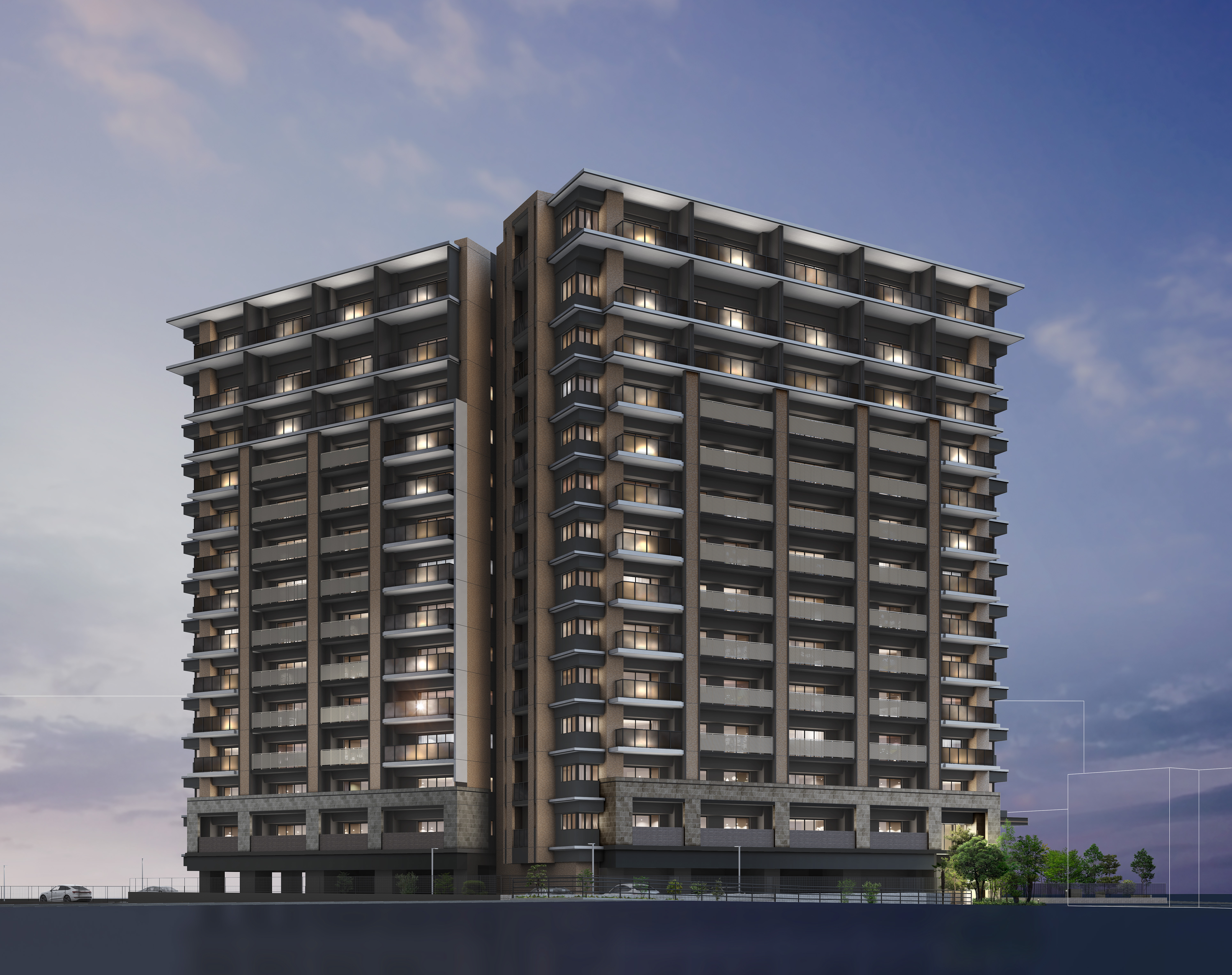 この胸がすくような風景の中、14階建、2棟構成の強さと重厚感をあわせもったその姿は、