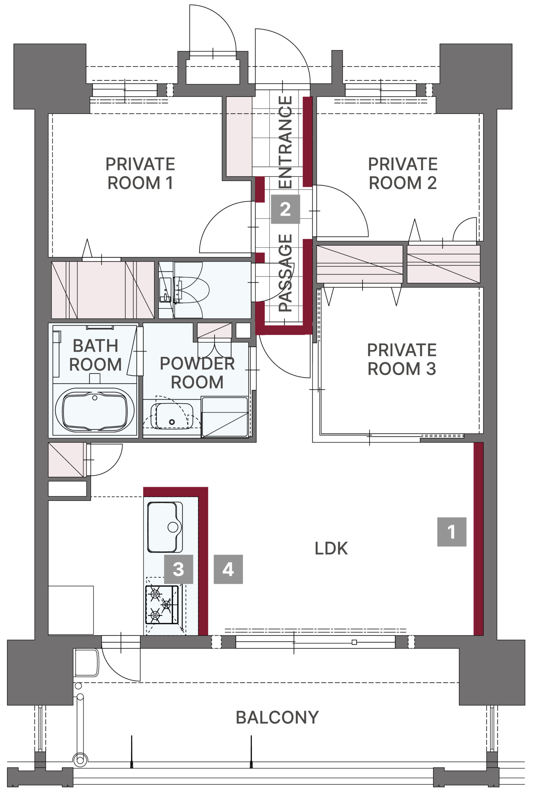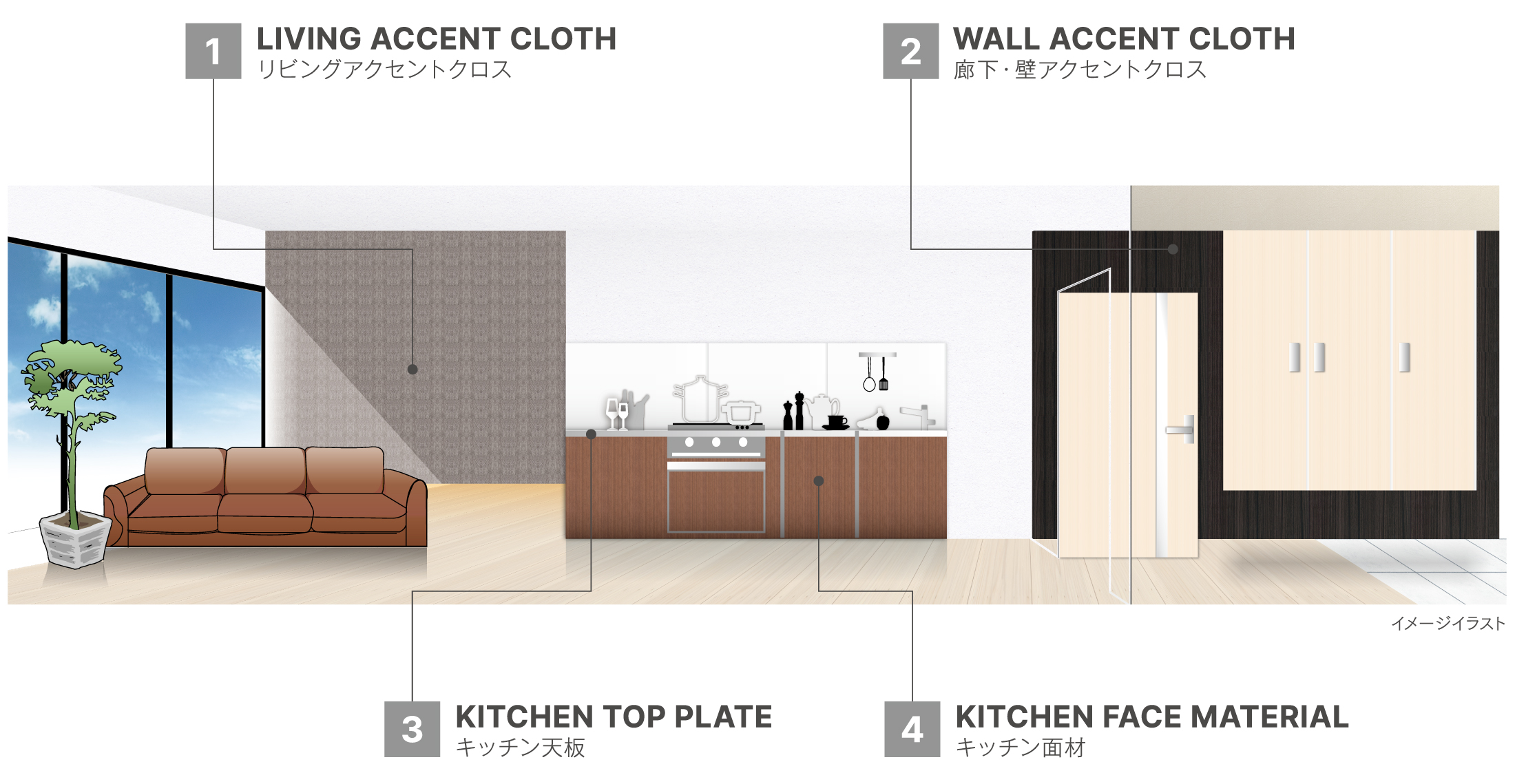 CUSTOM ORDER SYSTEM Customize Your Style 思いのままに、イメージ通りに。 さらに個性を追い求めたスタイルを実現。 STYLE SELECT 床材や建具のカラーを 自由自在にコーディネート。 キッチン扉もお好みに合わせて 選択できます。 お持ちの家具やお好きなイメージに合わせてカラーをコーディネート。また、無料で、お好みのカラーテイストやインテリアプランをご相談いただけます。 SELECT PLAN お部屋の間取りも ライフスタイルや趣味趣向、 ご家族の人数にあわせて ご選択いただけます。 例えば、リビングを拡張して広々とした1LDKプランへ。ライフスタイルに応じて、空間をワイドに。理想にもっとも叶うセレクトプランを、無料で選択できます。 CUSTOM ORDER もっと便利に、快適に、 それとも贅沢に。 設備や仕様もお好み通りの オーダーをどうぞ。 標準タイプから、設備や仕様をグレードアップ。機能性、デザイン性、そして素材や質の贅沢など、ご自分のこだわりに合わせてご注文いただけます。 CUSTOMIZE ITEM 自分らしく、個性を表現する カスタマイズ仕様。 素材をグレードアップ、 色彩をセレクトアップ。 カラーセレクトシステムは、DEUX・RESIAのオリジナル。廊下の壁・天井がアクセントクロス貼に、そしてリビングの壁一面がアクセントクロス貼と素材をグレードアップ。そのうえで、住まう人のお好みやお手持ちの家具に合わせカラーをセレクトしていただけます。 CUSTOMIZE MATERIAL ※掲載の写真は弊社のモデルルームを撮影したものに一部CG加工を施したもので、実際のものとは多少異なります。一部オプションも含まれます。なお、家具、備品などは価格に含まれません。 ※掲載の写真はメーカー提供写真、サンプルの一部を撮影したものになり、実際の色、模様と多少異なる場合がございます。選ばれる際は実物をご確認下さい。 EQUIPMENT TOP CUSTOMIZE PET KITCHEN EQUIPMENT BATHROOM EQUIPMENT SANITARY EQUIPMENT EQUIPMENT LIST ECO GAS SYSTEM ENE-SHARE PLAN SECURITY STRUCTURE AMENITY SAFETY CHECK
