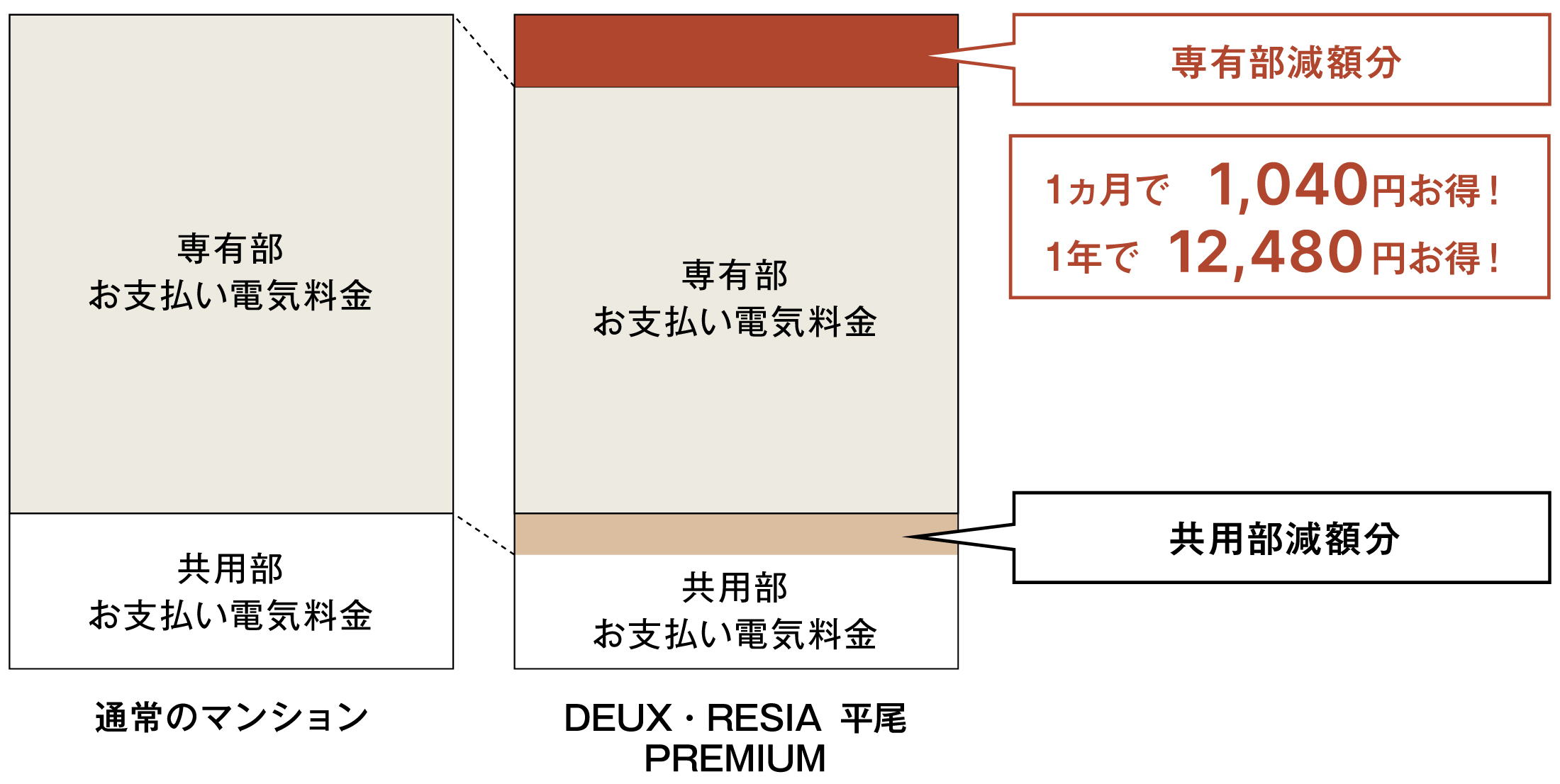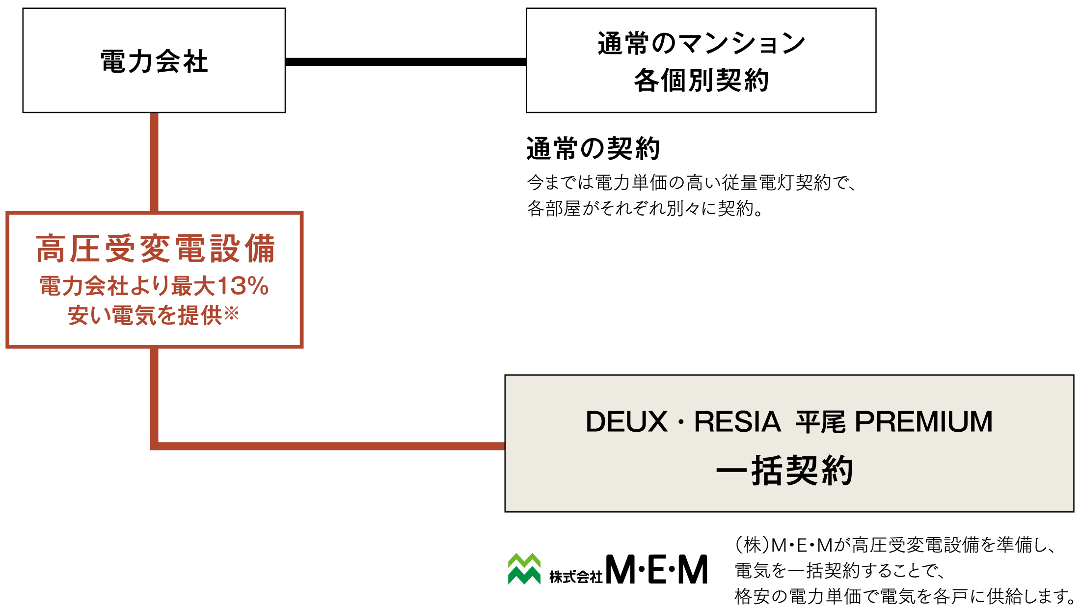 ENE-SHARE PLAN ECONOMY 01 電力会社より最大13%安い電気を提供。 高圧電力一括契約とは通常、各戸が個別に電力会社と契約していたものを、マンション単位で契約することで、より安い電力単価で電気を利用できるサービスです。「DEUX・RESIA平尾 PREMIUM」では(株)M・E・Mが提供するエネシェアプランを採用、ご家庭や共用部の電気料金が13%の割引になります。 ■高圧電力一括契約とは ※電気料金の割引率については、電力会社の料金改定などの要因により、予め全入居者の皆様にご案内した上で、変更する場合があります。 ECONOMY 02 (株)M·E·Mが高圧受変電設備を準備し、電気を一括契約することで、格安の電カ単価で電気を各戸に供給します。導入にかかる設備費用はもちろん、ご入居後にメンテナンスや設備入替え等の費用がかかることはありません。 CO2の削減にも貢献します。 エネルギー損失の少ない変圧器トップランナー型トランスを使用することで、二酸化炭素の削減にもつながります。 ■ たとえば4人家族で月額平均8,000円の電気料金をお支払いの場合 お客さまの電気料金※をまずは九州電力の計算方法で算出。 その後最大13%相当額を割引します。 ※電気料金=基本料金+電力量料金+燃料費調整額 [試算条件]九州電力従量電灯B契約単価にて算出。※国の制度的賦課金(再生可能エネルギー賦課金)は、割引対象外となります。 高圧電カ一括契約は今までオフィスピル等で採用されていたものが、電力の自由化による法案の改正でマンションヘの導入が可能になった注目のシステムです。ただ、どんな集合住宅でもこのシステムが導入できるわけではなく、一定規模以上の総戸数や間取りが必要といった制限があります。また、電気料金や電気使用量は、お客さまのPC・スマートフォン等を使って、(株)M·E·Mのホームページや専用アプリからいつでも確認することが可能です。日々の使用状況を確認し、電気を身近に感じることができます。 室内空気洗浄機能 浴室乾燥・暖房・換気システム 省エネ換気で消費電力を約77%低減!!※ 花粉、PM2.5、黄砂の複合作用に注意 発がんリスクを伴うPM2.5 花粉症デビューは低年齢化 花粉の驚異を最大化する黄砂とPM2.5 外干しは屋外の有害物質の出入り口 ※ACモーター搭載タイプとDCブラシレスモーター搭載タイプの開放風量(120㎡/h)時の比較。 住宅用高性能エアフィルター 外気の汚れを換気口でシャットアウト。 エアフィルターの特徴 プリーツ形状に加工された高分子素材のエレクトレット極細繊維が高い捕集効率を実現 換気に重要な圧力損失も考慮 再生樹脂を採用し環境にも配慮した新しいエアフィルター メンテナンスも簡単 ※掲載の写真・イラストは、本物件モデルルームを撮影したもの及び他物件施工例とメーカー提供資料で実際とは異なる場合があります。なお、備品などは価格に含まれません。 EQUIPMENT TOP CUSTOMIZE PET KITCHEN EQUIPMENT BATHROOM EQUIPMENT SANITARY EQUIPMENT EQUIPMENT LIST ECO GAS SYSTEM ENE-SHARE PLAN SECURITY STRUCTURE AMENITY SAFETY CHECK