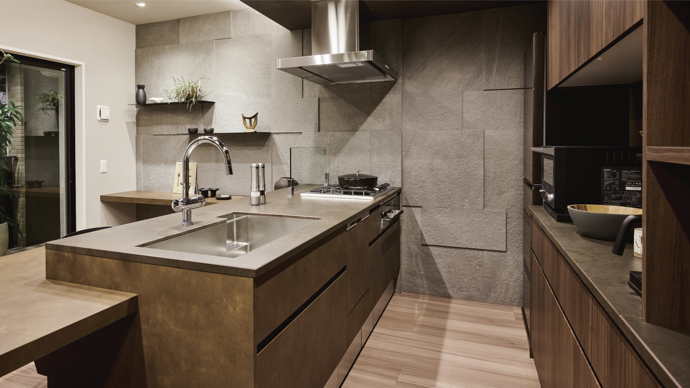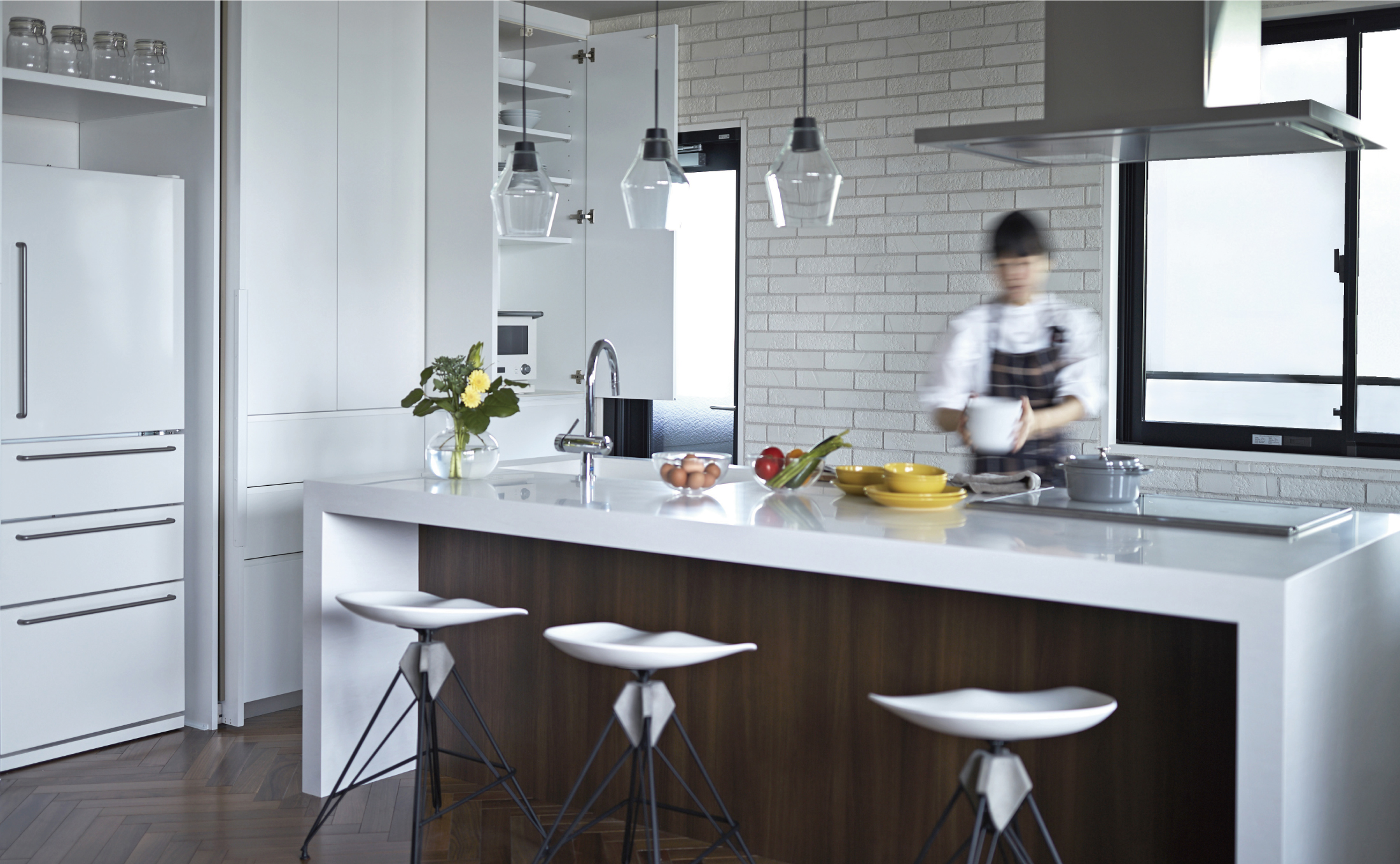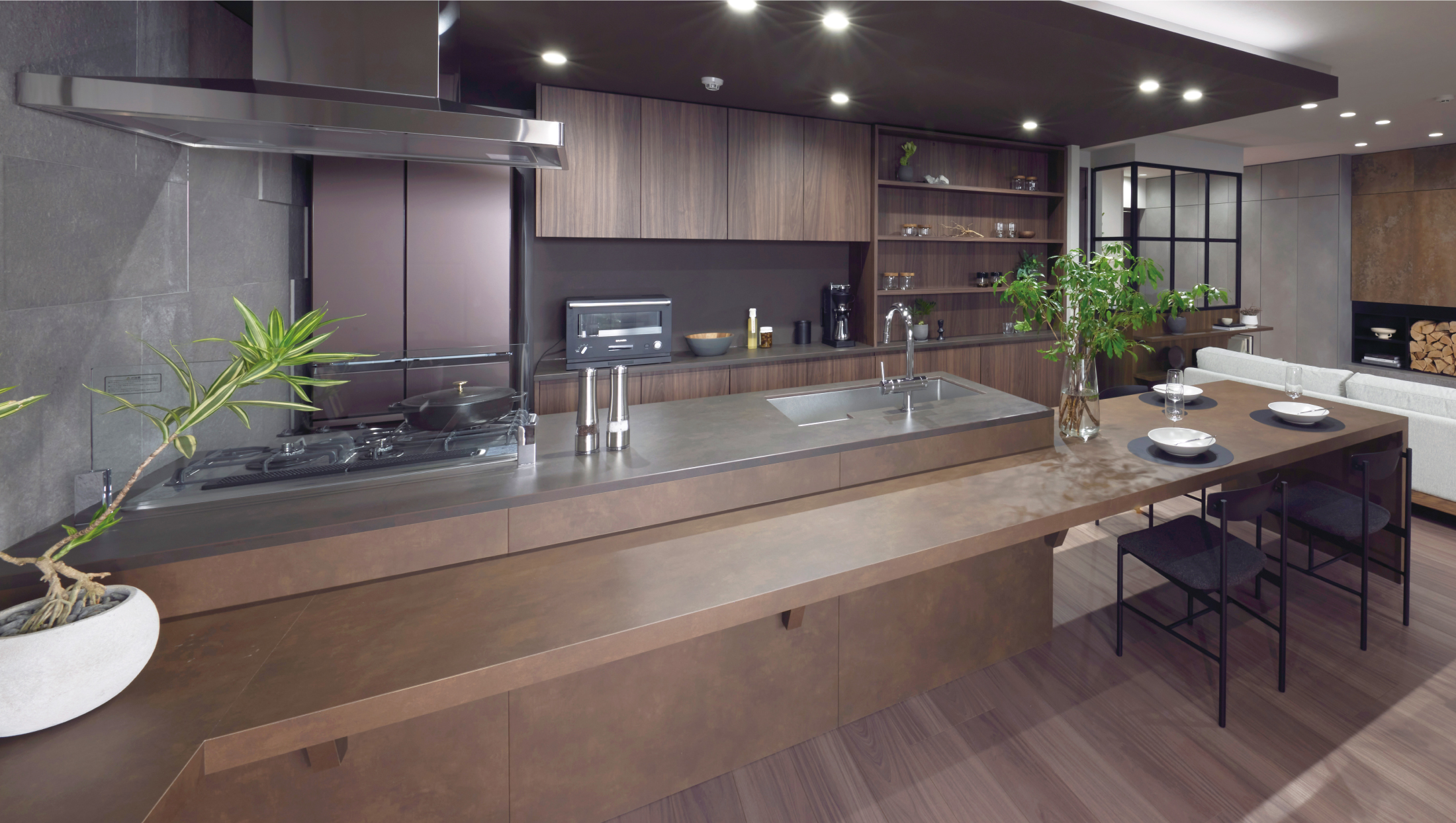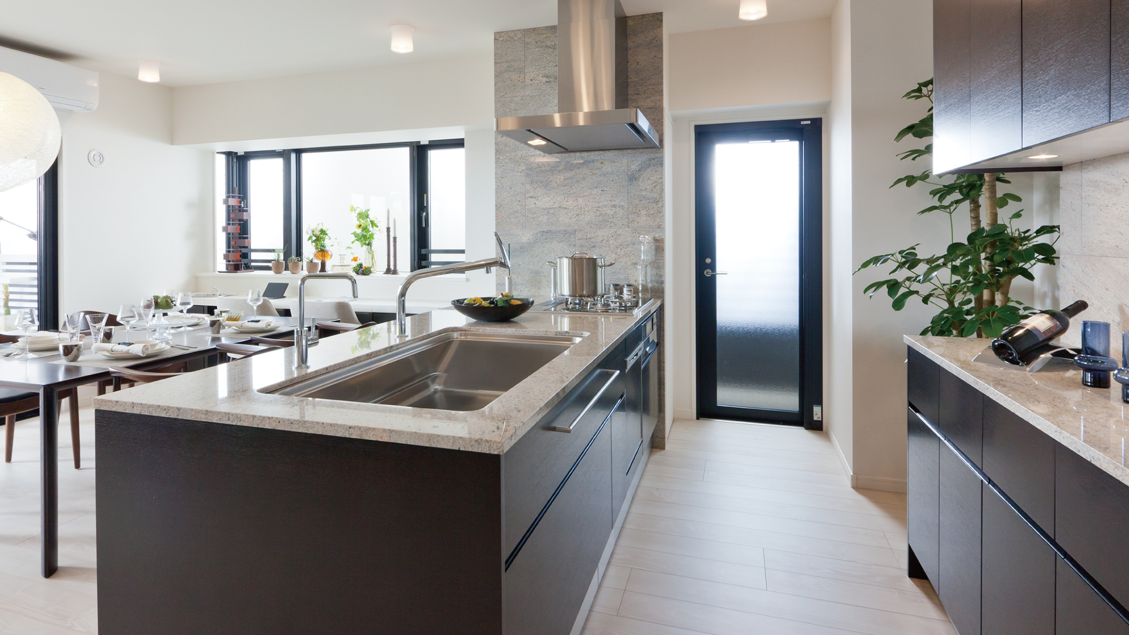 DESIGNER’S KITCHEN OPTION DESIGNER’S KITCHEN OPTION もっと楽しく、もっと便利に、快適に。進化を遂げたキッチンの新しいカタチ。 施工例 柔らかい光沢のある質感が清楚でエレガントな印象を演出。 MATERIAL SELECTION 人造大理石トップキッチン STONE TOP KITCHEN STYLE : I style MATERIAL : artificial marble 対面側のカウンターがワイドに設計されたキッチン。 料理や後片付けのときも家族やゲストに背を向けることなく、会話が遮られない。 空腹を満たし、生きていくために必要な栄養素と活力を採り入れる。キッチンは人の生活に大切な場所です。しかし、キッチンが居間と離れて存在していた昔の生活様式とは様変わりし、近年、キッチンは「食」を作り出す場としてだけでなく、人が集い、会話や笑顔を交わす場所としても重要視されるようになりました。朝目覚めた家族の顔色や表情を見て、健康状態や今日の予定を確認する。仕事や学校から帰ってきた家族が顔を合わせて今日一日の報告をする。友達を呼んでたわいない会話を楽しむ。キッチンで向かい合ったり、食を囲んだりすることで育まれる時間が重要視されるようになったのです。それに伴い、キッチンのカタチにも変化が求められるようになりました。リビングスペースからキッチンを孤立させないこと。そして居住空間にも違和感なく溶け込めるインテリアとしてのデザイン。美しく、そして家族の距離を近付けるための、アイデアが凝縮されています。 本格派の機能性とインテリアとしての美しさを兼ね備えたキッチン。 ワークトップはライフスタイルやお好みに合わせ、ステンレス、セラミック、御影石、人造大理石からお選びいただけます。 施工例 プロ仕様のこだわりが感じられる端正でシャープなデザイン。 MATERIAL SELECTION ステンレストップキッチン STAINLESS TOP KITCHEN STYLE : I style MATERIAL : stainless steel 施工例 耐久性、耐熱性、防汚性が高く、肌触りの良い高級感を演出。 MATERIAL SELECTION セラミックトップキッチン CERAMIC TOP KITCHEN STYLE : I style MATERIAL : ceramic 施工例 素材の持ち味を活かし重厚な雰囲気を演出。 MATERIAL SELECTION 御影石トップキッチン STONE TOP KITCHEN STYLE : I style MATERIAL : granite OPTION ITEMS image 3 STEP SINK 3ステップシンク 3枚の専用プレートを3段のリブにセットすることで、シンクの中で調理作業ができ、作業効率が高まります。 施工例 COUNTER TABLE カウンターテーブル 朝食やティータイムなどに新たなスタイルを提案します。 施工例 BACK SIDE SHELF 背面収納棚 システムキッチンのリビング側に収納棚を設置。都会的でスタイリッシュに空間を彩ります。 施工例 KITCHEN CUPBOARD キッチンカップボード 背面側に食器や調理器具を収納できる棚を設けました。作業スペースとしても便利です。 KITCHEN EQUIPMENT 美しく快適な生活空間を創出するハイグレード性能を搭載。 ガスコンロや調理台の広さ、取り出しやすさを考えた収納など、調理の時間をできるだけ省けるような工夫を散りばめました。 KITCHEN COUNTER TOP 再加工しやすいキッチンカウンタートップ 天板は壁に埋め込むのが普通ですが、経年のことを考え、取り替えや再加工がしやすい施工にしています。 KITCHEN COUNTER SELECT キッチンカウンターセレクト キッチンカウンターの高さを身長に合わせ、3段階の高さからお選びいただけます。(80cm・85cm・90cm)キッチンの高さの目安[身長÷2+5cm] STANDARD ITEMS 1 ダンパー付きレンジフード モダンなフォルムで停止時は室外の音と空気をシャットアウトします。 ※タイプによって形状が異なります。 2 カトラリートレー 引出しの中のスプーンやフォーク、お箸などの整理に便利です。 ※A、E、Eg、F、Fgn、Gタイプを除く。 3 包丁差し 安全性を考慮した包丁差し。ラップやまな板も収納できます。 ※タイプによって形状が異なります。 4 ソフトクローズ式引出し収納 軽い力でスムーズに開閉する引出し収納。開閉時の衝撃を和らげるエアークッションを付けました。 ※チャイルドロック付き 5 巾木収納 デッドスペースとなりがちなキッチンの最下段まで無駄なく利用できる巾木収納を採用。 ※A、E、Eg、F、Fgn、Gタイプを除く。 6 静音シンク ステンレス製でお手入れがしやすく、底面裏には水音を軽減するサイレントシートが貼られています。 ※タイプによって形状寸法が異なります。 7 ガスコンロ 高火力バーナーに、温度調節機能を備えたタイプ。無水両面焼きグリル付きです。 ※参考写真 8 食器洗い乾燥機 高温で清潔に洗い上げる食器洗い乾燥機を標準装備。食後の後片付けがグンとラクになります。 ※参考写真 9 浄水機能付きノズルホース混合水栓 塩素やゴミ、鉄サビを除去する殺菌セラミック内蔵カートリッジを採用。雑菌の増殖を抑えます。 10 キッチンタオルハンガー システムキッチンの引出し収納パネルに便利なタオルハンガーを設置しました。 11 ガラスディバイダー 視界を妨げず、キッチンの開放感を保つクリアなガラススクリーン。調理時の油ハネや汚れの広がりを防ぎます。 O