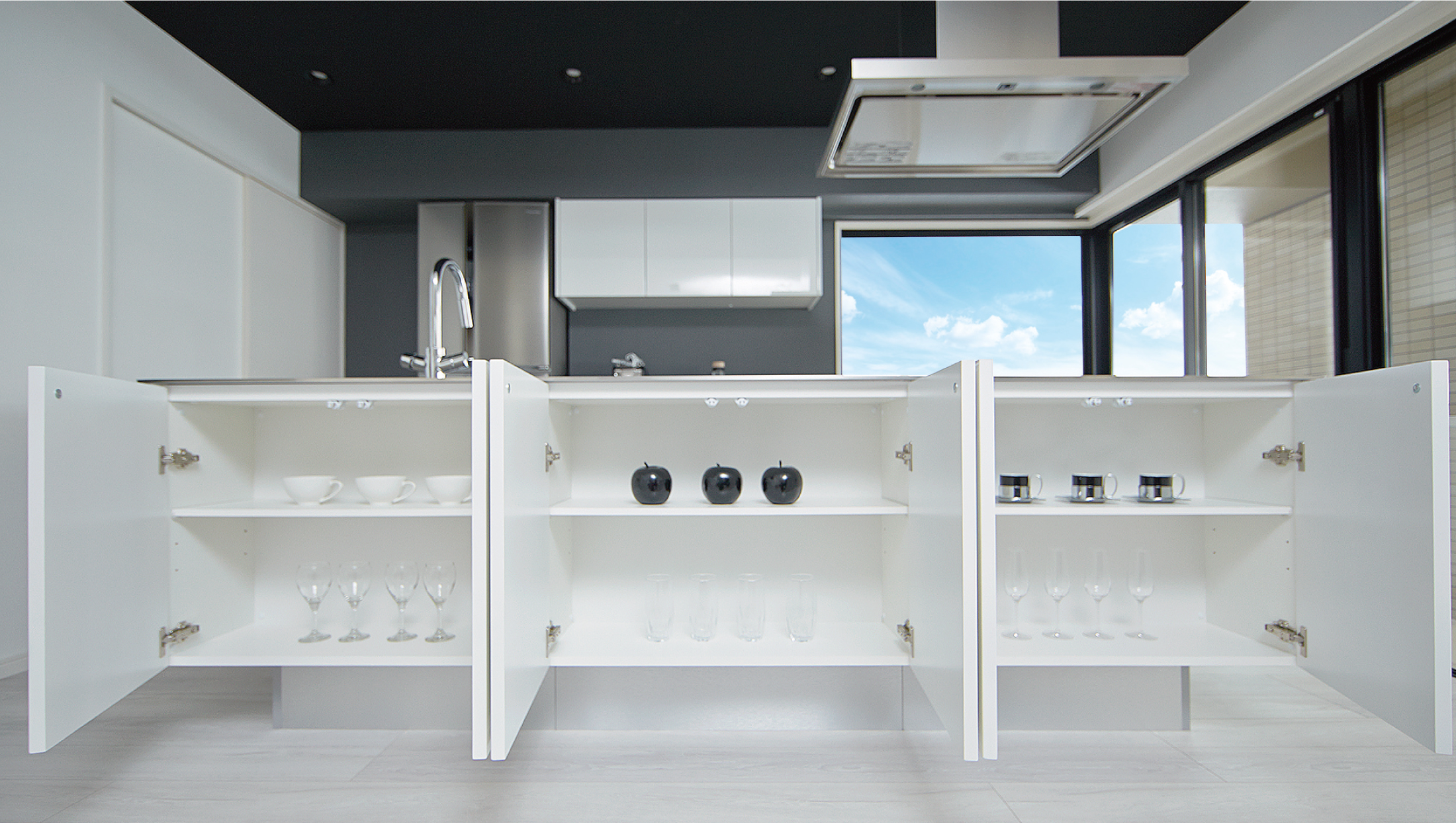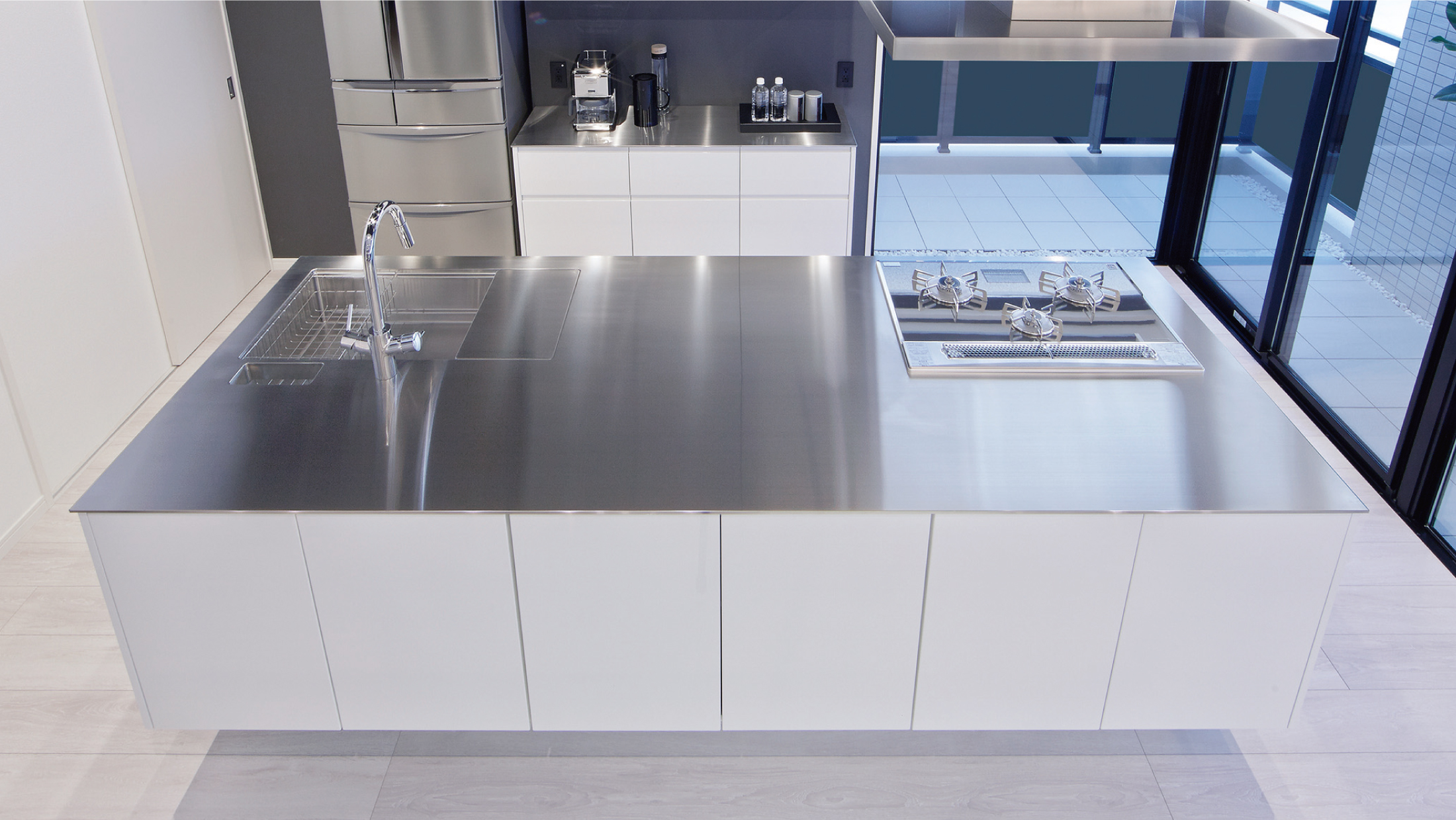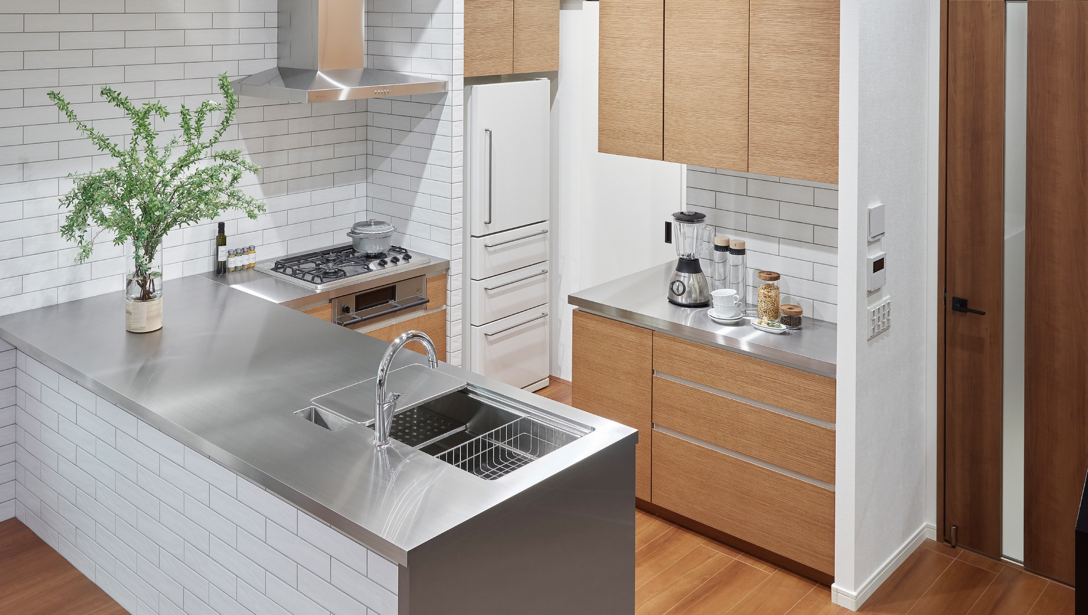 DESIGNER’S KITCHEN OPTION DESIGNER’S KITCHEN OPTION もっと楽しく、もっと便利に、快適に。進化を遂げたキッチンの新しいカタチ。 施工例 柔らかい光沢のある質感が清楚でエレガントな印象を演出。 MATERIAL SELECTION 人造大理石トップキッチン STONE TOP KITCHEN STYLE : I style MATERIAL : artificial marble 対面側のカウンターがワイドに設計されたキッチン。 料理や後片付けのときも家族やゲストに背を向けることなく、会話が遮られない。 空腹を満たし、生きていくために必要な栄養素と活力を採り入れる。キッチンは人の生活に大切な場所です。しかし、キッチンが居間と離れて存在していた昔の生活様式とは様変わりし、近年、キッチンは「食」を作り出す場としてだけでなく、人が集い、会話や笑顔を交わす場所としても重要視されるようになりました。朝目覚めた家族の顔色や表情を見て、健康状態や今日の予定を確認する。仕事や学校から帰ってきた家族が顔を合わせて今日一日の報告をする。友達を呼んでたわいない会話を楽しむ。キッチンで向かい合ったり、食を囲んだりすることで育まれる時間が重要視されるようになったのです。それに伴い、キッチンのカタチにも変化が求められるようになりました。リビングスペースからキッチンを孤立させないこと。そして居住空間にも違和感なく溶け込めるインテリアとしてのデザイン。美しく、そして家族の距離を近付けるための、アイデアが凝縮されています。 本格派の機能性とインテリアとしての美しさを兼ね備えたキッチン。 ワークトップはライフスタイルやお好みに合わせ、ステンレス、セラミック、御影石、人造大理石からお選びいただけます。 施工例 プロ仕様のこだわりが感じられる端正でシャープなデザイン。 MATERIAL SELECTION ステンレストップキッチン STAINLESS TOP KITCHEN STYLE : I style MATERIAL : stainless steel 施工例 耐久性、耐熱性、防汚性が高く、肌触りの良い高級感を演出。 MATERIAL SELECTION セラミックトップキッチン CERAMIC TOP KITCHEN STYLE : I style MATERIAL : ceramic 施工例 素材の持ち味を活かし重厚な雰囲気を演出。 MATERIAL SELECTION 御影石トップキッチン STONE TOP KITCHEN STYLE : I style MATERIAL : granite OPTION ITEMS image 3 STEP SINK 3ステップシンク 3枚の専用プレートを3段のリブにセットすることで、シンクの中で調理作業ができ、作業効率が高まります。 施工例 COUNTER TABLE カウンターテーブル 朝食やティータイムなどに新たなスタイルを提案します。 施工例 BACK SIDE SHELF 背面収納棚 システムキッチンのリビング側に収納棚を設置。都会的でスタイリッシュに空間を彩ります。 施工例 KITCHEN CUPBOARD キッチンカップボード 背面側に食器や調理器具を収納できる棚を設けました。作業スペースとしても便利です。 KITCHEN EQUIPMENT 美しく快適な生活空間を創出するハイグレード性能を搭載。 ガスコンロや調理台の広さ、取り出しやすさを考えた収納など、調理の時間をできるだけ省けるような工夫を散りばめました。 KITCHEN COUNTER TOP 再加工しやすいキッチンカウンタートップ 天板は壁に埋め込むのが普通ですが、経年のことを考え、取り替えや再加工がしやすい施工にしています。 KITCHEN COUNTER SELECT キッチンカウンターセレクト キッチンカウンターの高さを身長に合わせ、3段階の高さからお選びいただけます。(80cm・85cm・90cm)キッチンの高さの目安[身長÷2+5cm] STANDARD ITEMS 1 ダンパー付きレンジフード モダンなフォルムで停止時は室外の音と空気をシャットアウトします。 ※タイプによって形状が異なります。 2 カトラリートレー 引出しの中のスプーンやフォーク、お箸などの整理に便利です。 ※A、E、Eg、F、Fgn、Gタイプを除く。 3 包丁差し 安全性を考慮した包丁差し。ラップやまな板も収納できます。 ※タイプによって形状が異なります。 4 ソフトクローズ式引出し収納 軽い力でスムーズに開閉する引出し収納。開閉時の衝撃を和らげるエアークッションを付けました。 ※チャイルドロック付き 5 巾木収納 デッドスペースとなりがちなキッチンの最下段まで無駄なく利用できる巾木収納を採用。 ※A、E、Eg、F、Fgn、Gタイプを除く。 6 静音シンク ステンレス製でお手入れがしやすく、底面裏には水音を軽減するサイレントシートが貼られています。 ※タイプによって形状寸法が異なります。 7 ガスコンロ 高火力バーナーに、温度調節機能を備えたタイプ。無水両面焼きグリル付きです。 ※参考写真 8 食器洗い乾燥機 高温で清潔に洗い上げる食器洗い乾燥機を標準装備。食後の後片付けがグンとラクになります。 ※参考写真 9 浄水機能付きノズルホース混合水栓 塩素やゴミ、鉄サビを除去する殺菌セラミック内蔵カートリッジを採用。雑菌の増殖を抑えます。 10 キッチンタオルハンガー システムキッチンの引出し収納パネルに便利なタオルハンガーを設置しました。 11 ガラスディバイダー 視界を妨げず、キッチンの開放感を保つクリアなガラススクリーン。調理時の油ハネや汚れの広がりを防ぎます。 O