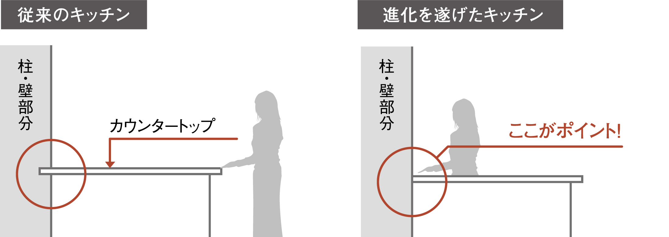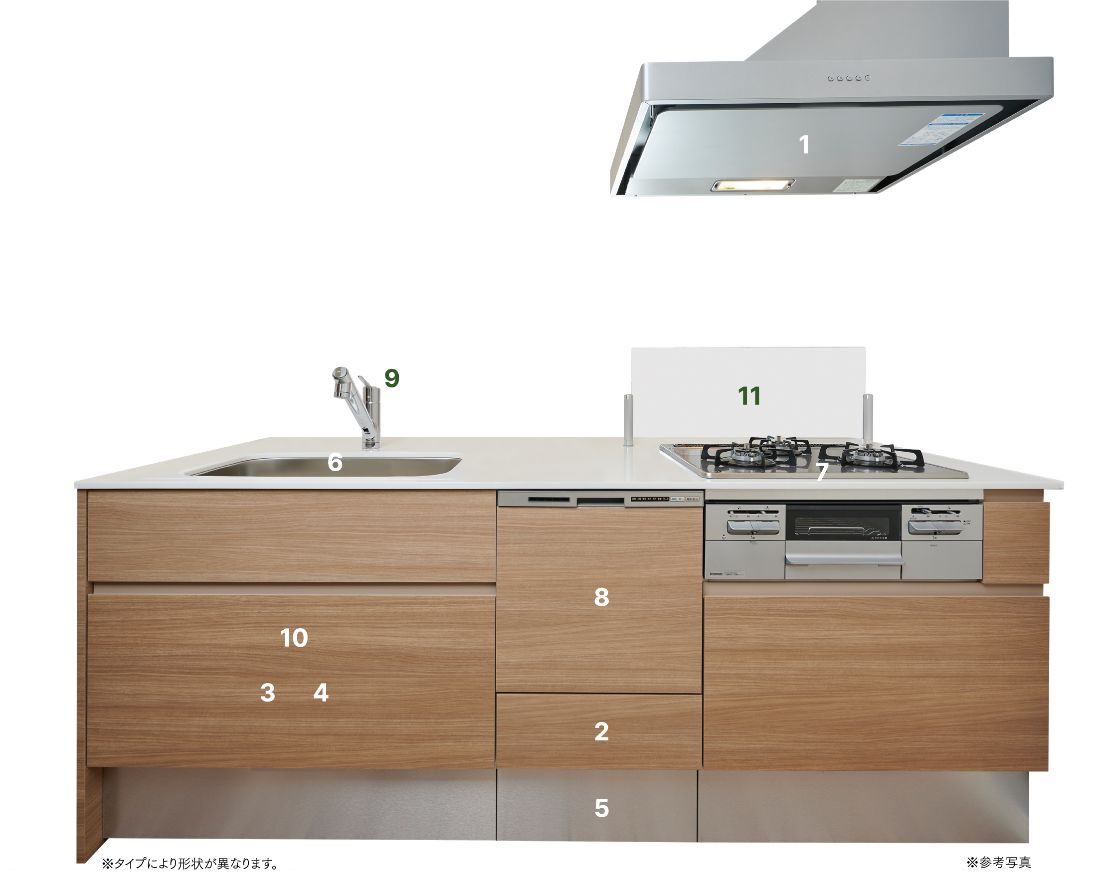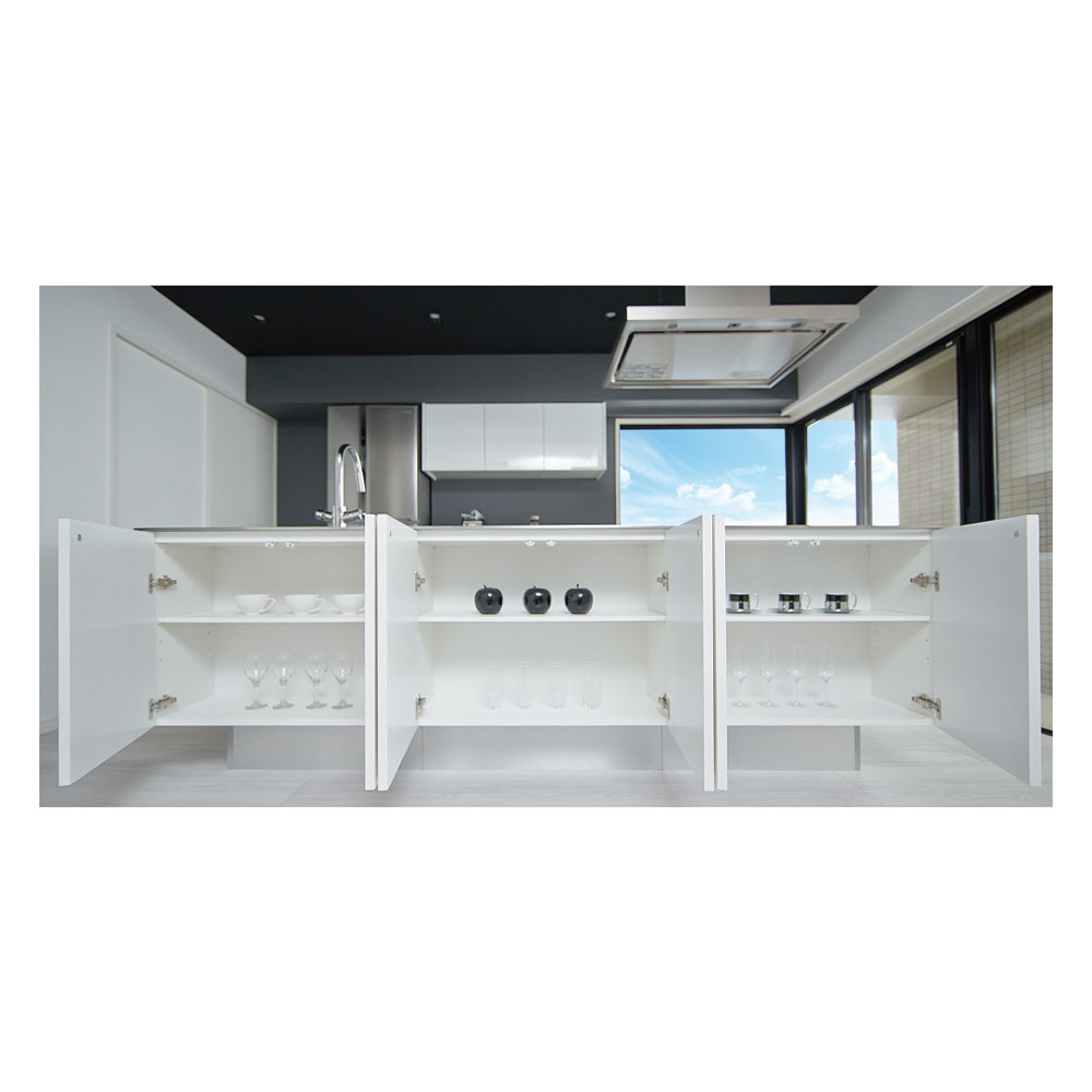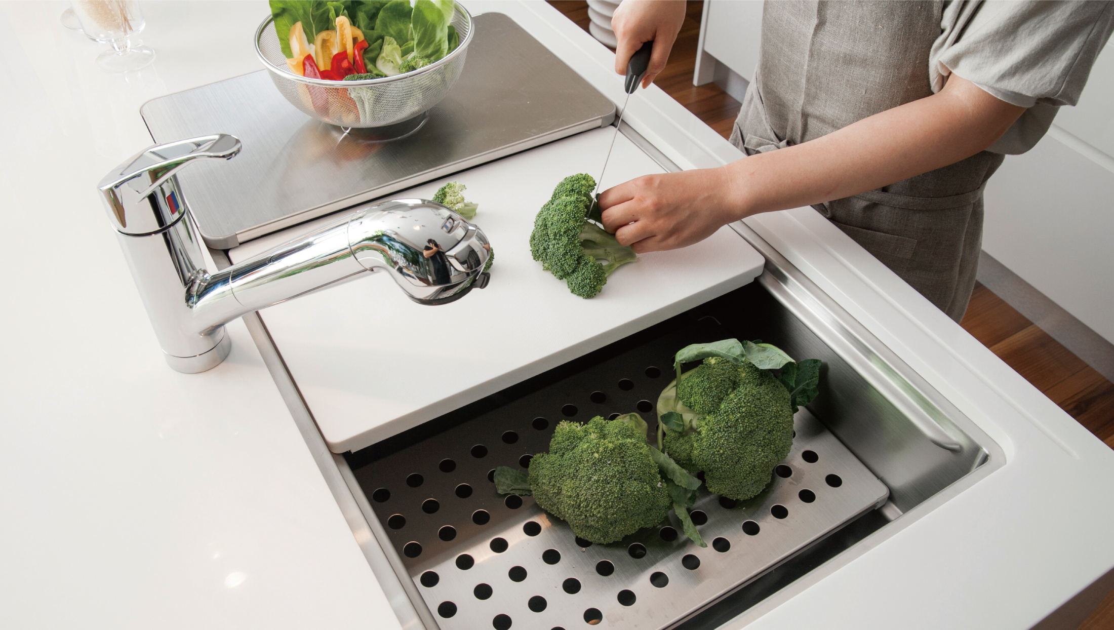 DESIGNER’S KITCHEN OPTION DESIGNER’S KITCHEN OPTION もっと楽しく、もっと便利に、快適に。進化を遂げたキッチンの新しいカタチ。 施工例 柔らかい光沢のある質感が清楚でエレガントな印象を演出。 MATERIAL SELECTION 人造大理石トップキッチン STONE TOP KITCHEN STYLE : I style MATERIAL : artificial marble 対面側のカウンターがワイドに設計されたキッチン。 料理や後片付けのときも家族やゲストに背を向けることなく、会話が遮られない。 空腹を満たし、生きていくために必要な栄養素と活力を採り入れる。キッチンは人の生活に大切な場所です。しかし、キッチンが居間と離れて存在していた昔の生活様式とは様変わりし、近年、キッチンは「食」を作り出す場としてだけでなく、人が集い、会話や笑顔を交わす場所としても重要視されるようになりました。朝目覚めた家族の顔色や表情を見て、健康状態や今日の予定を確認する。仕事や学校から帰ってきた家族が顔を合わせて今日一日の報告をする。友達を呼んでたわいない会話を楽しむ。キッチンで向かい合ったり、食を囲んだりすることで育まれる時間が重要視されるようになったのです。それに伴い、キッチンのカタチにも変化が求められるようになりました。リビングスペースからキッチンを孤立させないこと。そして居住空間にも違和感なく溶け込めるインテリアとしてのデザイン。美しく、そして家族の距離を近付けるための、アイデアが凝縮されています。 本格派の機能性とインテリアとしての美しさを兼ね備えたキッチン。 ワークトップはライフスタイルやお好みに合わせ、ステンレス、セラミック、御影石、人造大理石からお選びいただけます。 施工例 プロ仕様のこだわりが感じられる端正でシャープなデザイン。 MATERIAL SELECTION ステンレストップキッチン STAINLESS TOP KITCHEN STYLE : I style MATERIAL : stainless steel 施工例 耐久性、耐熱性、防汚性が高く、肌触りの良い高級感を演出。 MATERIAL SELECTION セラミックトップキッチン CERAMIC TOP KITCHEN STYLE : I style MATERIAL : ceramic 施工例 素材の持ち味を活かし重厚な雰囲気を演出。 MATERIAL SELECTION 御影石トップキッチン STONE TOP KITCHEN STYLE : I style MATERIAL : granite OPTION ITEMS image 3 STEP SINK 3ステップシンク 3枚の専用プレートを3段のリブにセットすることで、シンクの中で調理作業ができ、作業効率が高まります。 施工例 COUNTER TABLE カウンターテーブル 朝食やティータイムなどに新たなスタイルを提案します。 施工例 BACK SIDE SHELF 背面収納棚 システムキッチンのリビング側に収納棚を設置。都会的でスタイリッシュに空間を彩ります。 施工例 KITCHEN CUPBOARD キッチンカップボード 背面側に食器や調理器具を収納できる棚を設けました。作業スペースとしても便利です。 KITCHEN EQUIPMENT 美しく快適な生活空間を創出するハイグレード性能を搭載。 ガスコンロや調理台の広さ、取り出しやすさを考えた収納など、調理の時間をできるだけ省けるような工夫を散りばめました。 KITCHEN COUNTER TOP 再加工しやすいキッチンカウンタートップ 天板は壁に埋め込むのが普通ですが、経年のことを考え、取り替えや再加工がしやすい施工にしています。 KITCHEN COUNTER SELECT キッチンカウンターセレクト キッチンカウンターの高さを身長に合わせ、3段階の高さからお選びいただけます。(80cm・85cm・90cm)キッチンの高さの目安[身長÷2+5cm] STANDARD ITEMS 1 ダンパー付きレンジフード モダンなフォルムで停止時は室外の音と空気をシャットアウトします。 ※タイプによって形状が異なります。 2 カトラリートレー 引出しの中のスプーンやフォーク、お箸などの整理に便利です。 ※A、E、Eg、F、Fgn、Gタイプを除く。 3 包丁差し 安全性を考慮した包丁差し。ラップやまな板も収納できます。 ※タイプによって形状が異なります。 4 ソフトクローズ式引出し収納 軽い力でスムーズに開閉する引出し収納。開閉時の衝撃を和らげるエアークッションを付けました。 ※チャイルドロック付き 5 巾木収納 デッドスペースとなりがちなキッチンの最下段まで無駄なく利用できる巾木収納を採用。 ※A、E、Eg、F、Fgn、Gタイプを除く。 6 静音シンク ステンレス製でお手入れがしやすく、底面裏には水音を軽減するサイレントシートが貼られています。 ※タイプによって形状寸法が異なります。 7 ガスコンロ 高火力バーナーに、温度調節機能を備えたタイプ。無水両面焼きグリル付きです。 ※参考写真 8 食器洗い乾燥機 高温で清潔に洗い上げる食器洗い乾燥機を標準装備。食後の後片付けがグンとラクになります。 ※参考写真 9 浄水機能付きノズルホース混合水栓 塩素やゴミ、鉄サビを除去する殺菌セラミック内蔵カートリッジを採用。雑菌の増殖を抑えます。 10 キッチンタオルハンガー システムキッチンの引出し収納パネルに便利なタオルハンガーを設置しました。 11 ガラスディバイダー 視界を妨げず、キッチンの開放感を保つクリアなガラススクリーン。調理時の油ハネや汚れの広がりを防ぎます。 O