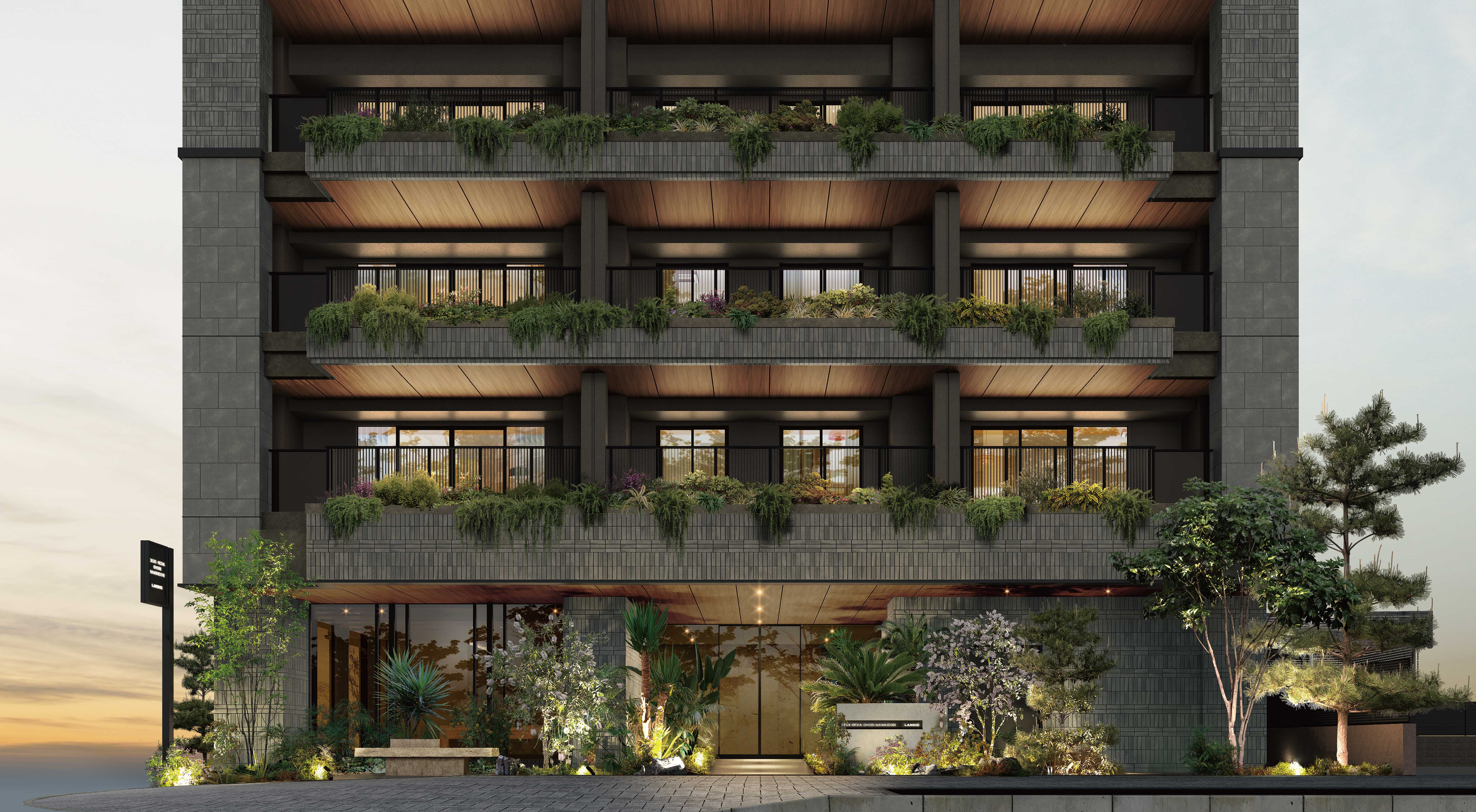 直線が織りなす端正なフォルムを、有機的に包み込む地表面の木々と、2階から4階のバルコニーを立体的に彩る豊かな植栽が、