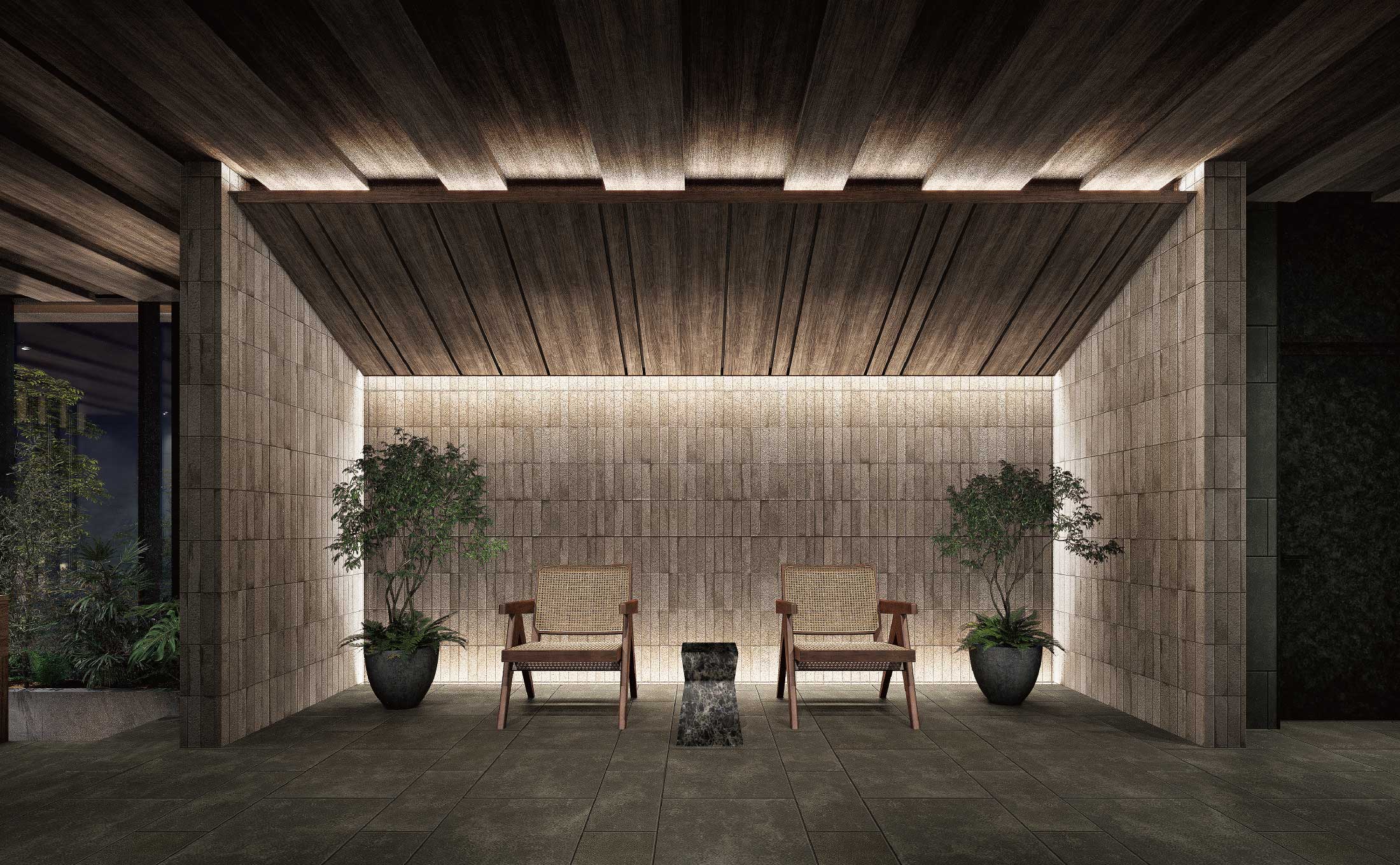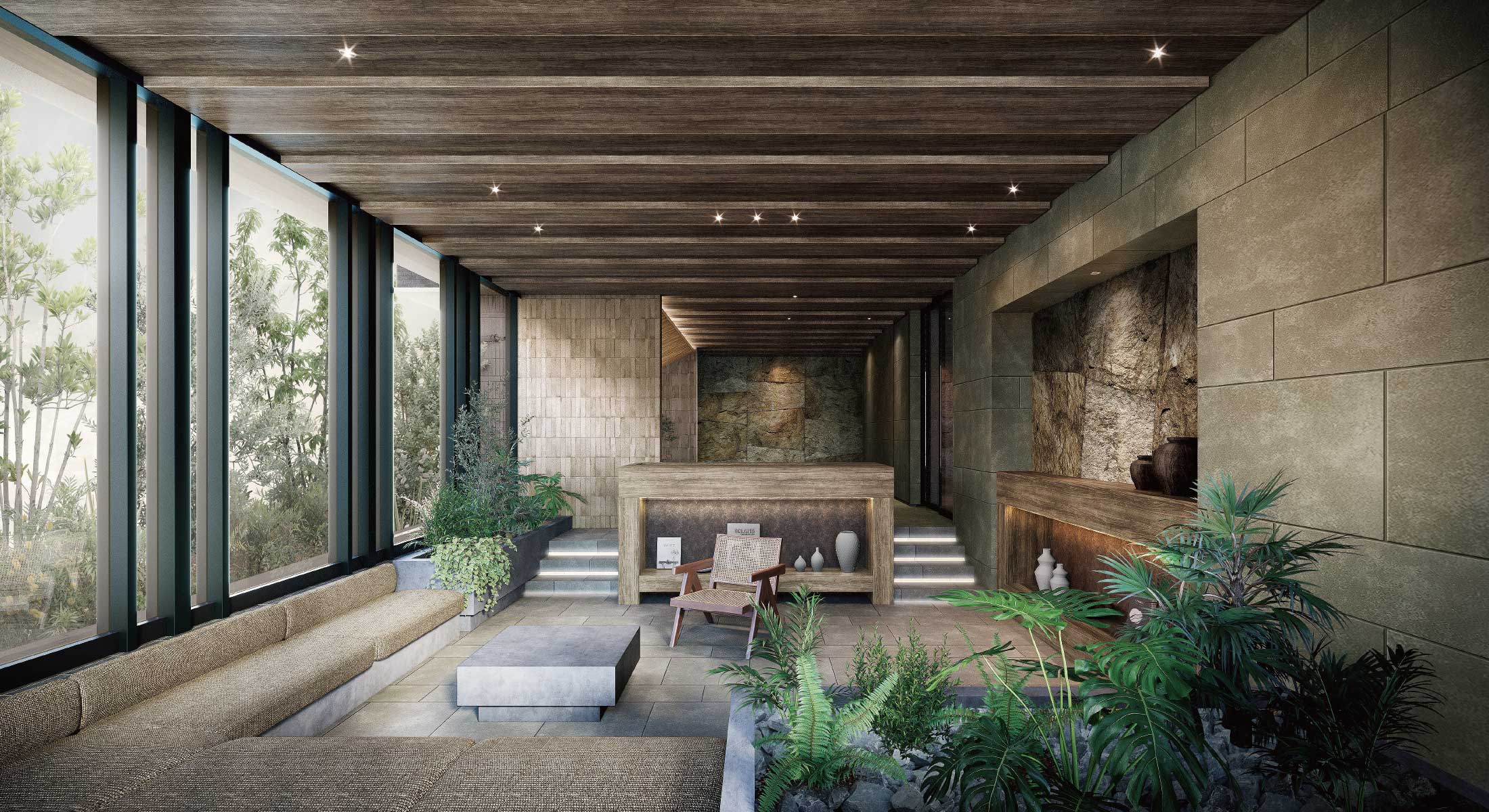 石や木の自然素材をモチーフにしたマテリアルと、光の陰影が調和し、静けさの中に凛とした空気感が漂うエントランスホール。