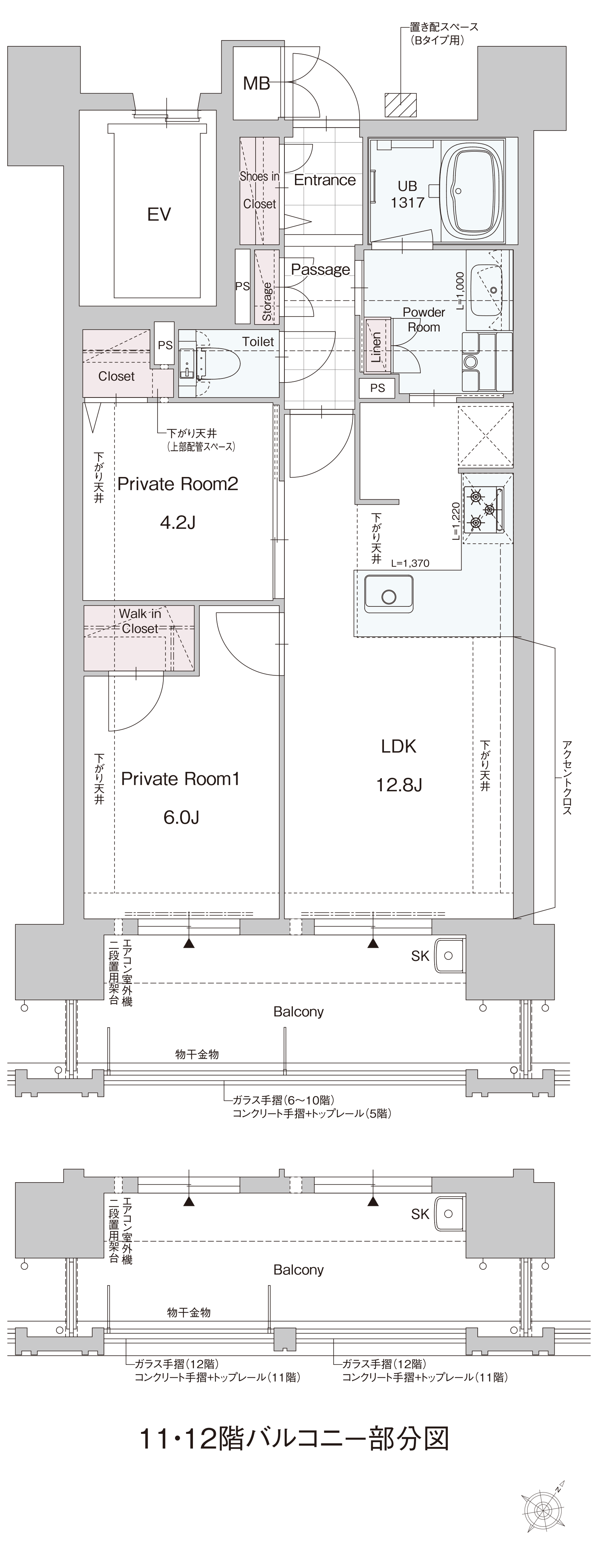 ※11・12FのLDK・プライベートルームの天井には、数カ所スプリンクラーが設置されます。