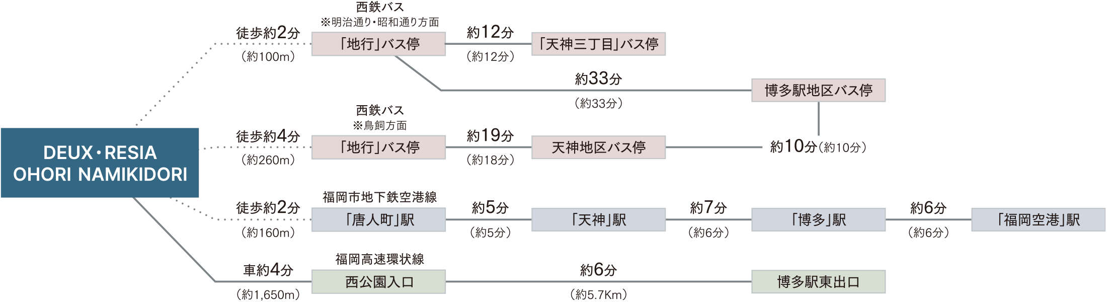 ※車分数は一般道はGoogle MAPの所要時間検索(平日8:00、幅がある場合は最短)で算出、都市高速道路は福岡北九州高速道路公社サイトによる標準所要時間を表示しています。