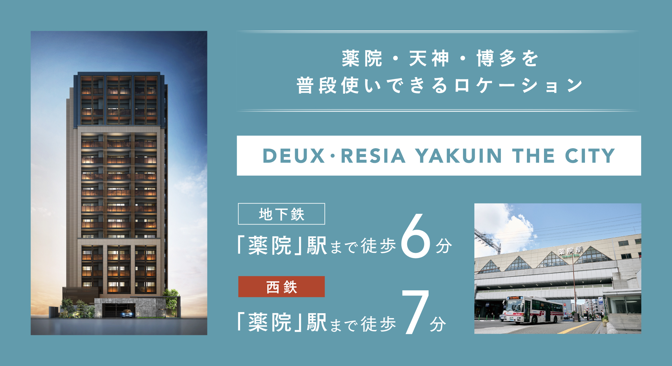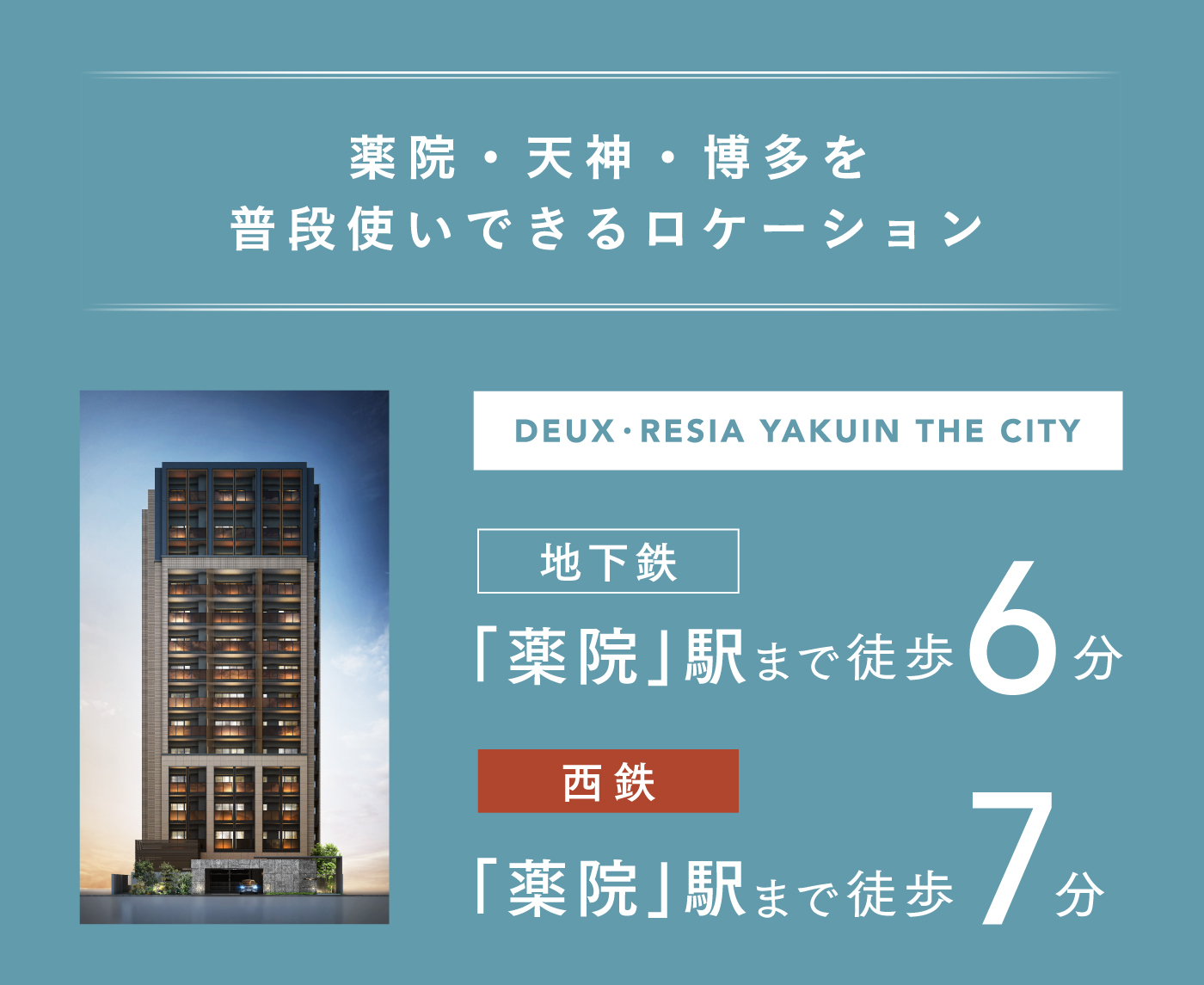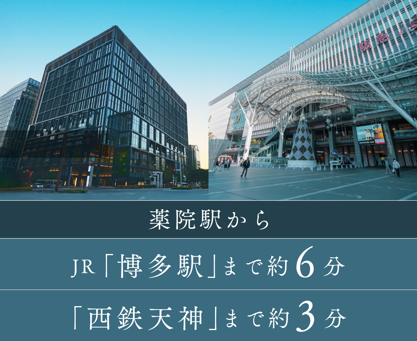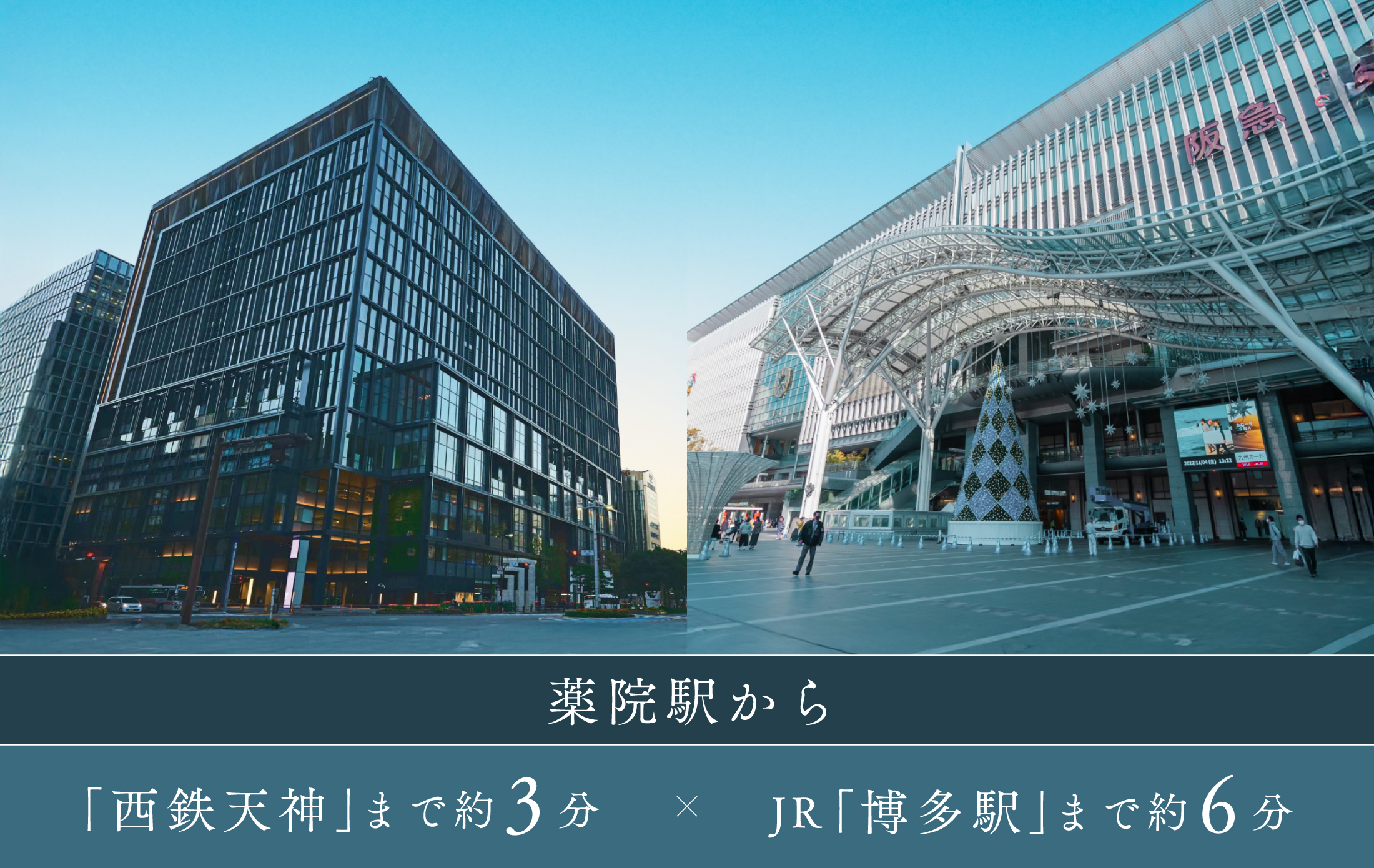 地下鉄・西鉄のダブルアクセスを叶える、福岡都心のセンターエリア ※福岡三越(西鉄福岡(天神)駅直結)、JR博多シティ(地下鉄博多駅直結) アクセス利便と個性を兼ね備えた街 地下鉄七隈線・西鉄天神大牟田線「薬院」駅から徒歩6〜7分。天神・博多の主要エリアを日常使いできる、福岡都心のセンターポジションです。天神はファッションやグルメ、ショッピングの中心地で、最新のトレンドに触れられる距離感。博多も徒歩圏内でJR博多駅へのアクセスが良く、通勤や市内外への移動も快適です。二つの都心を自由に使いこなせる立地で、便利さと暮らしやすさを両立できます。 LOCATION 薬院駅エリアの限られたレジデンス 薬院駅 徒歩7分圏内のマンション供給は『7物件』 九州産業研究所によると、福岡市内の過去5年のマンション(270物件中※)において、西鉄と地下鉄「薬院」駅まで徒歩7分以内のマンションは7物件のみ。 ※2019~2024年10月4日時点(予告広告物件含む)[出典元:株式会社リクルート SUUMO] スタイルのある街。スタイルのある暮らし。 福岡市民の「住みたい街(駅)」ランキング(※)では、JR博多駅エリアに次ぎ第2位にランクインしている薬院駅エリア。県内外を問わず、多くの人が押し寄せる大型店舗が連なる天神エリアとは違い、自身の感度にこだわる都市居住者の審美眼に適う、個性的で独自の世界観を持つスポットが点在することで、他の街にはない味わいと、ここにしかない空気感を形成しているのです。この魅力的な街にアドレスを置き、その住人となることで、今までとは一味も二味も違う、伸びやかでスタイルのある暮らしが叶いそうです。 ※2023年版・SUUMO「住みたい自治体ランキング福岡版」株式会社リクルート調べ LIFE-INFORMATION