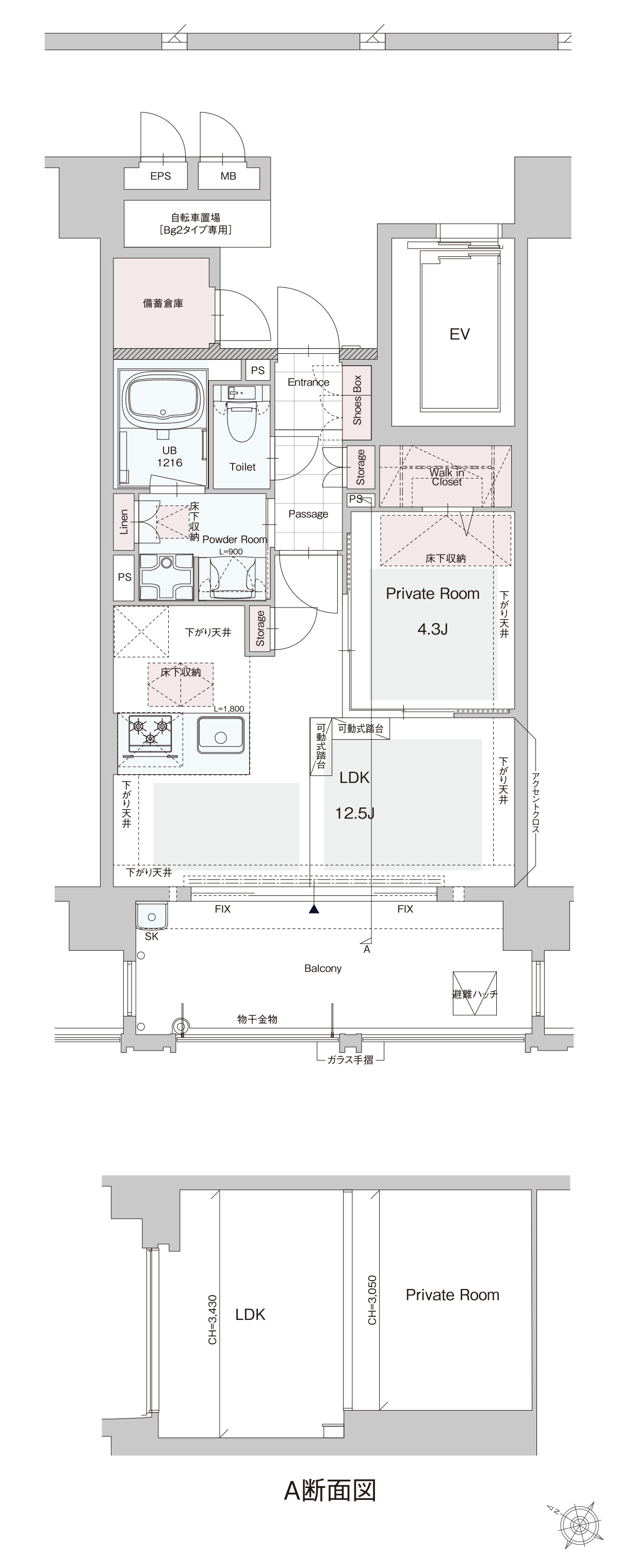 Bg type | 1LDK 専有面積/ 43.90m² (13.27坪)(備蓄倉庫面積2.17m²含む) バルコニー面積/ 11.30m² (3.41坪) ※LDK・プライベートルーム・ガレーロの天井には、数カ所スプリンクラーが付きます。 専有面積/ 43.90m² (13.27坪)(備蓄倉庫面積2.17m²含む) バルコニー面積/ 11.30m² (3.41坪) ※LDK・プライベートルーム・ガレーロの天井には、数カ所スプリンクラーが付きます。 Bg1 type(13F)Bg2メニュー2(14F) B type | 1LDK 前の間取り ROOM PLAN一覧 ROOM PLAN